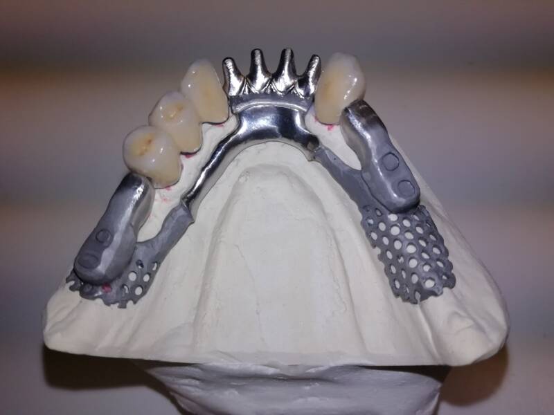 - Arcata inferiore: Corone in metallo-ceramica DIVA Nobil Metal. Progettazione attacchi Bredent MiniSV e protesi scheletrata eseguita con software 3SHAPE, e realizzazione in laser-synth. Elementi posteriori inmetallo-ceramica.