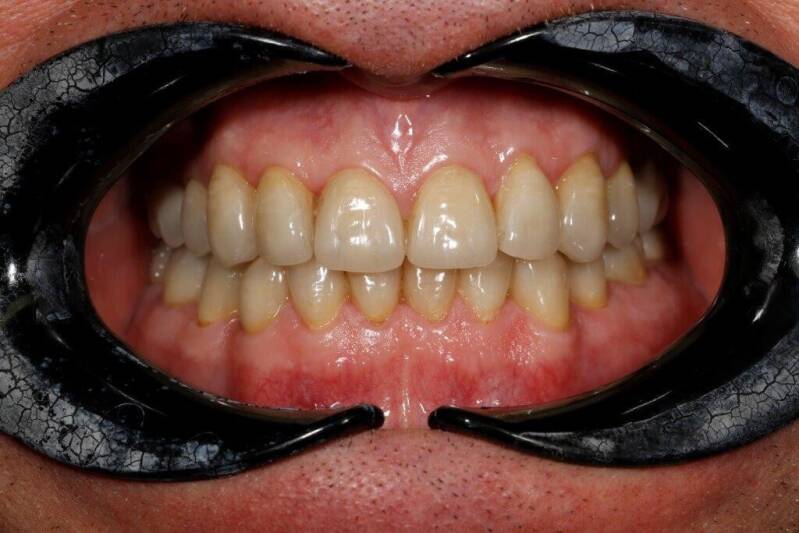 - Riabilitazione completa della funzione masticatoria, eseguita con uso di arco facciale e articolatore Denar: 24 corone singole in disilicato di litio Emax per la massimazione del risultato estetico.