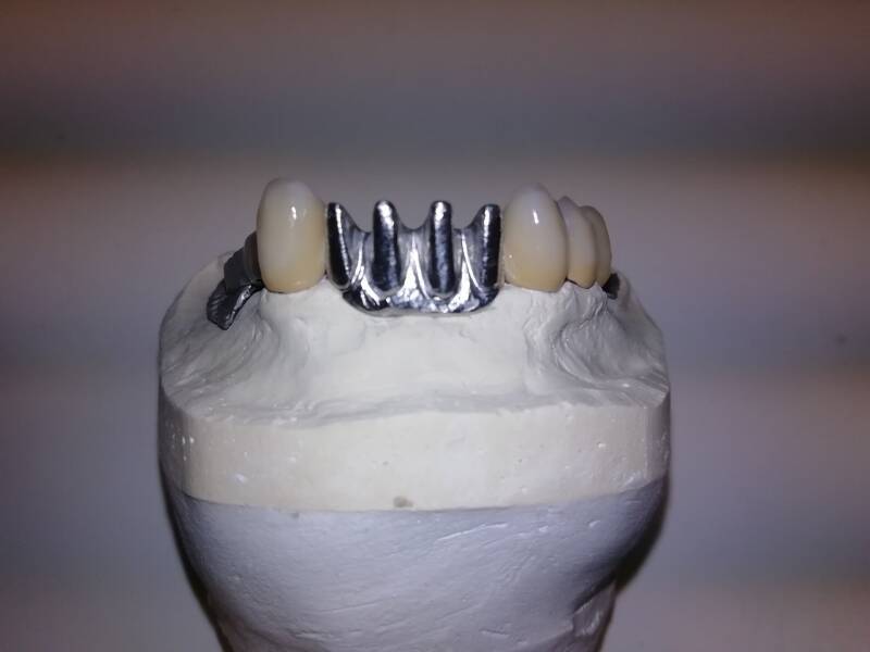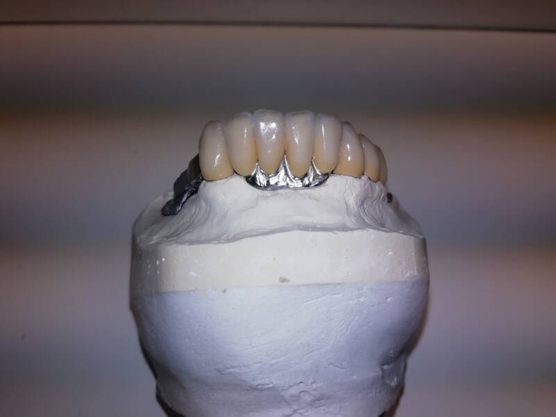 - Arcata superiore in metallo-ceramica su corone primarie telescopiche. Progettazione eseguita con software 3SHAPE. Struttura metallica eseguita in laser-melting. Ceramica DIVA Nobil Metal stratificata con tecnica Multi Layer a 10 masse con uso di internal Stain Noritake.