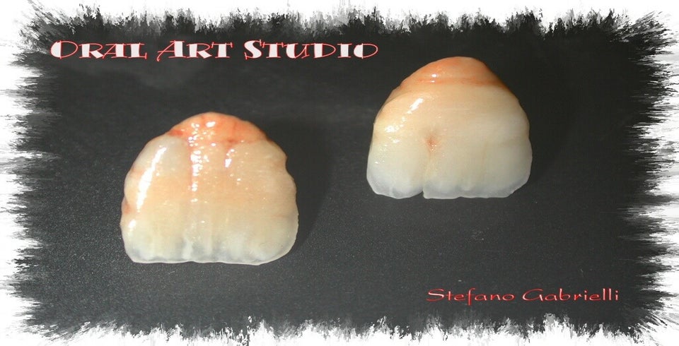 - Temporary arch projected with the 3Shape software and made of multi-layered Bredent PMMA material and milled in CAM. Characterization made of Bredent surface stains.